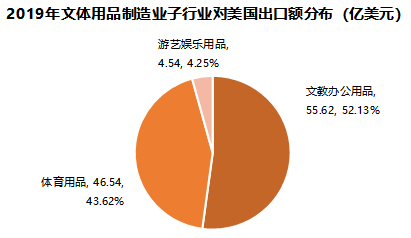 2019年,对美出口下降,占比缩小。美国是我国文体用品第一大出口市场,全年对美国累计出口额106.70亿美元,占对所有国家出口总额的23.97%,占比较2018年下降2.77个百分点;行业对美国出口累计同比下降6.53%,增速较上年下降16.03个百分点。3个子行业对美出口比重见下图。