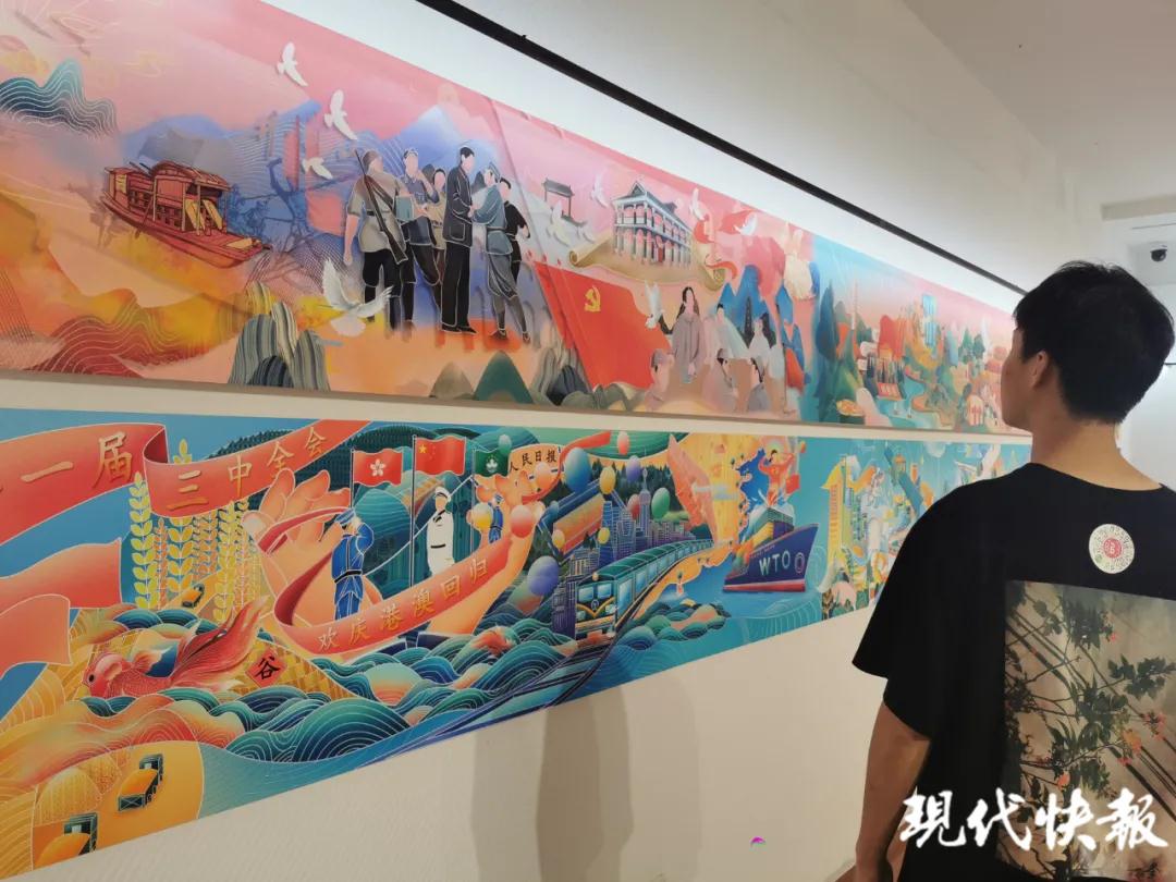 在视觉传达学院毕业设计展厅里,一幅《党史“艺”百年》绘画作品尤其引人关注。20级视觉传播设计与制作专业学生田雨晨正兴致勃勃地向前来参观、体验的观众进行介绍和演示。这是一部用MR新科技展现百年党史的14个历史坐标的作品。现场一位王姓体验者通过手机扫描小程序,并对着画作中“南湖红船”进行选定,通过自拍,就形成了一幅自己与“南湖红船”画作的合影。一会,照片在旁边配套的小型打印机上打印出来。拿着这张体验作品,她满心欢喜地说:“体验感太强了,这与以前光看没有参与的艺术作品不一样,还有参观‘成果’呢。” 田雨晨介绍:“画中14个场景都可以自由选择,在参观后留下一幅幅留影照片,既方便又快捷。这是视觉传达学院毕业生专门为今年中国共产党建党100周年创作的。让人在交互体验中感受历史的脉动。”