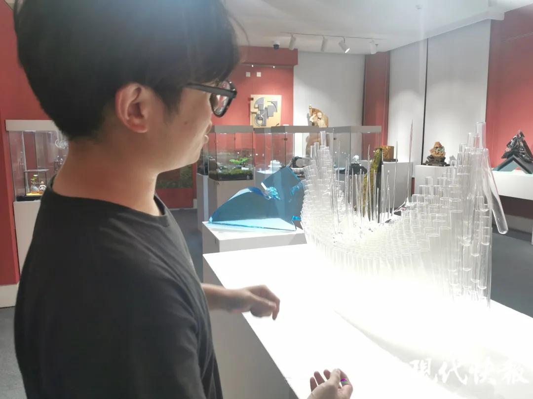 在手工艺术学院的展厅里,毕业生陈怡薇介绍了自己化2个多月创作的陶瓷设计与工艺作品《石生花》,这位来自山西的姑娘说,她的灵感就来自对石头中生命的感悟,通过塑形、雕刻和烧制,她的系列作品诞生了。毕业生朱晓铭在指导老师王义锋的提示下尝试用试管进行整合烧制,创作了名为《银幕·镜壁》的玻璃艺术品。他在满怀欣喜的同时,还是不无遗憾地对自己的作品留下了更多的期待,“把这种圆的形制表达得更充分些就好了”他说。