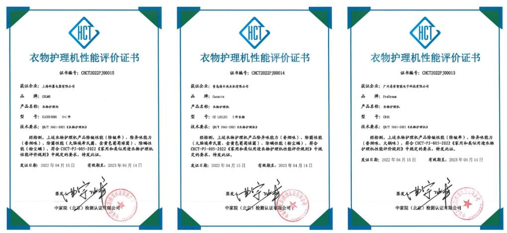 消费日报网讯 4月15日,中国家用电器研究院测试计量技术研究所主办,《家用电器》杂志支持,中家院(北京)检测认证有限公司(中国家用电器检测所)健康家电检测中心技术支持,首批通过QB/T 5661-2021《衣物护理机》行标产品在北京发布。