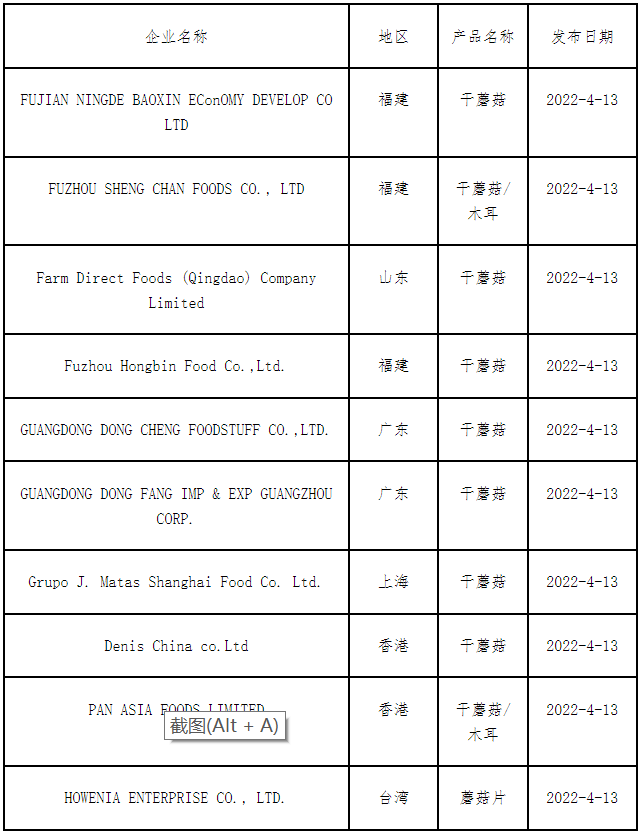 2022年4月13日,美国FDA发布进口预警(IA25-05),有十家蘑菇出口企业获得美国“绿名单”(Green List)资格,意味着这十家公司输美蘑菇产品可以正常通关,免予遭受“到岸自动扣留”(DWPE)处置。具体信息如下: