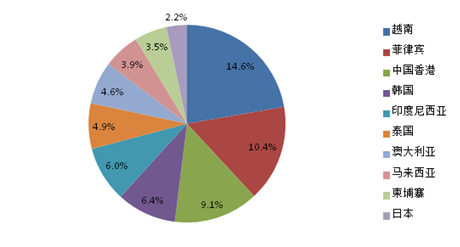 2021年,我国出口RCEP成员国陶瓷641.8亿元,约占我国出口陶瓷的32.4%。以陶瓷砖产品为例,2021年我国陶瓷砖出口264.1亿元,排名前十的国家和地区中有九个来自RCEP国家,依次是越南、菲律宾、韩国、印度尼西亚、泰国、澳大利亚、马来西亚、柬埔寨、日本。