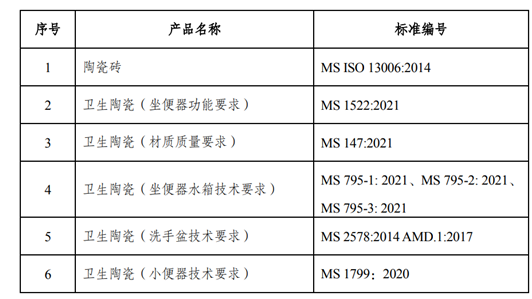 根据马来西亚贸工部520 号法案5(2011 年修正案)要求,进口建筑卫生陶瓷产品必须经过合规程序马来西亚标准(MS)的要求,再由马来西亚标准局指定认证机构出具合格评定证书后,才能在马来西亚海关清关。