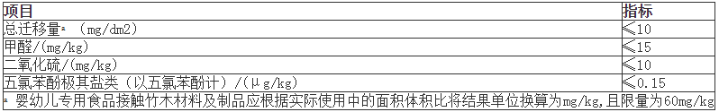 微生物指标:预期与食品直接接触、且不经过消毒或清洗直接使用的竹木材料及制品的微生物应符合GB 14934的规定,与食物、烹饪或者加工前需经去皮、去壳或清洗的食品接触的竹木材料及制品除外。