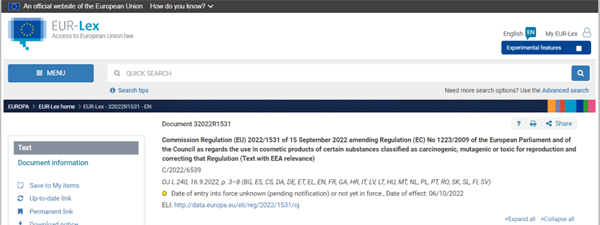 2022年9月15日,欧盟发布了最新法规(EU) 2022/1531, 对十几种致癌、致突变或生殖毒性(CMR)物质实施了禁令和限制, 并更新了欧盟化妆品法规(EC) No 1223/2009的附录II、附录III和附录V相关规定。该法规自发布日起20天后生效,其中关于CMR物质的禁令于2022年12月17日生效。