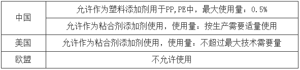 目前UV-328在中国食品接触材料、美国食品接触材料法规中依然授权了部分用途,欧盟食品接触材料法规中则淘汰了该物质。具体允许使用情况整理如下表: