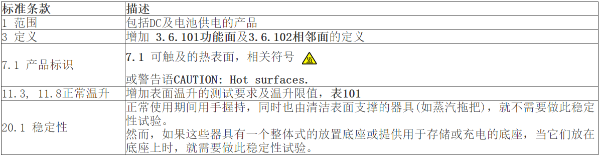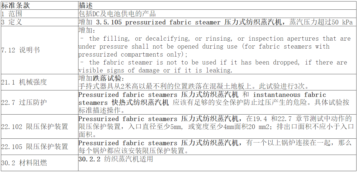 结合IEC 60335-1:2020第六版更新的PART 2 标准在陆续出版,本期将对IEC 60335-2-3:2022电熨斗,IEC 60335-2-54:2022使用液体或蒸汽的家用表面清洁器具,IEC 60335-2-85:2022纺织物蒸汽机,共3个标准版本更新重点解析: