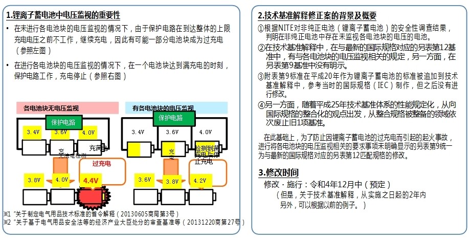 2022年11月4日,日本经济产业省(METI)发布“关于修订部分解释确定电气和产品技术标准的部令的通知”和“关于修订经济产业大臣根据《电气和材料安全法》处置的审查标准的部分通知”,该电池修订法拟废除别表第9,意见征集截止时间为2022年12月3日。
