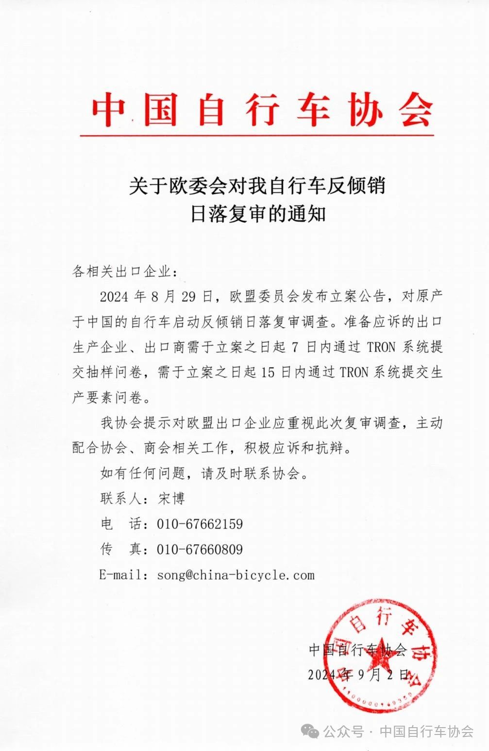 关于欧委会对我自行车反倾销日落复审的通知