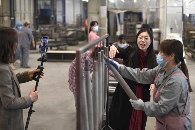 4月9日,位于山东省菏泽市牡丹区的天荣智能家居小镇生产车间内,带货主播正在通过直播介绍家具的制造流程工艺,销售家具。