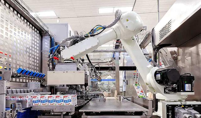伊利集团液态奶生产基地车间里智能机器正在进行产品码垛