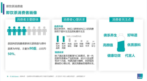 茶饮料的消费群体主要为90后,比袋泡茶与原叶茶更为年轻。对于这些消费者来说,即饮茶除了要满足基本的需求以外,还要从产品的包装、设计以及运营等多个方面,传递话题与情绪,来获取心理认同、满足其情感诉求。