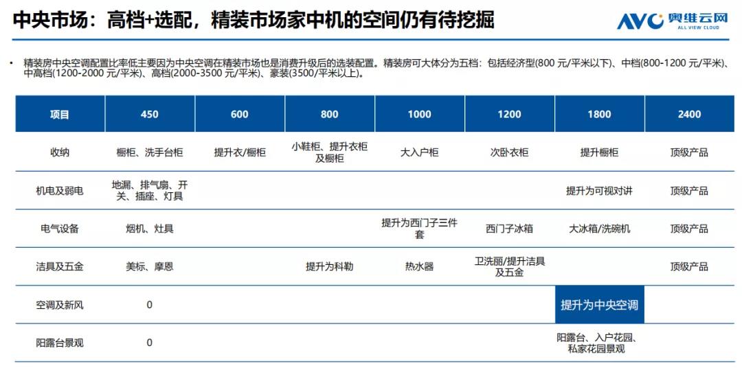 但另一方面,是实现市场增长的过程中,家用中央空调的产品痛点也是长期一直存在的。首先,因为安装隐蔽,大量的管线在吊顶内,一旦故障,检修起来非常费时费力;其次,当一台多联机故障时,往往影响整体的多联机功能。另外,以价格成本计算,根据奥维云网数据,精装房大体分为五档,包括经济型(800元/平米以下)、中档(800-1200元/平米)、中高档(1200-2000元/平米)、高档(2000-3500元/平米)、豪装(3500/平米以上)。当精装修价格达到1800/平米也就是接近高档的时候,空调配置才会提升为中央空调,价格相对而言更为昂贵。