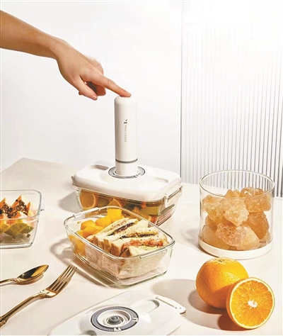 抽真空保鲜盒是当前最受关注的新品,它在传统保鲜盒的基础上增加了抽真空设计,用配套的电动真空泵可一键将保鲜盒内的空气抽出。各种食材、肉类海鲜、药材都可以采用真空存储,保持新鲜。而保鲜盒本身采用高硼硅玻璃,耐冷耐热,从冰箱拿出后可以直接进微波炉、烤箱加热。以水果为例,普通存储可保鲜7天,真空存储可达到17天。