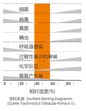 除了温度, 湿度对健康的室内空气质量也至关重要。如果室内的气溶胶或病毒遇到干燥的黏膜,感染的风险就会大大增加。研究也表明了,病毒在干燥的表面存活的时间要比在较潮湿的环境条件下更长。因此,对室内空气进行适当地加湿(相对湿度40-60%)也是确保室内空气安全的关键因素。