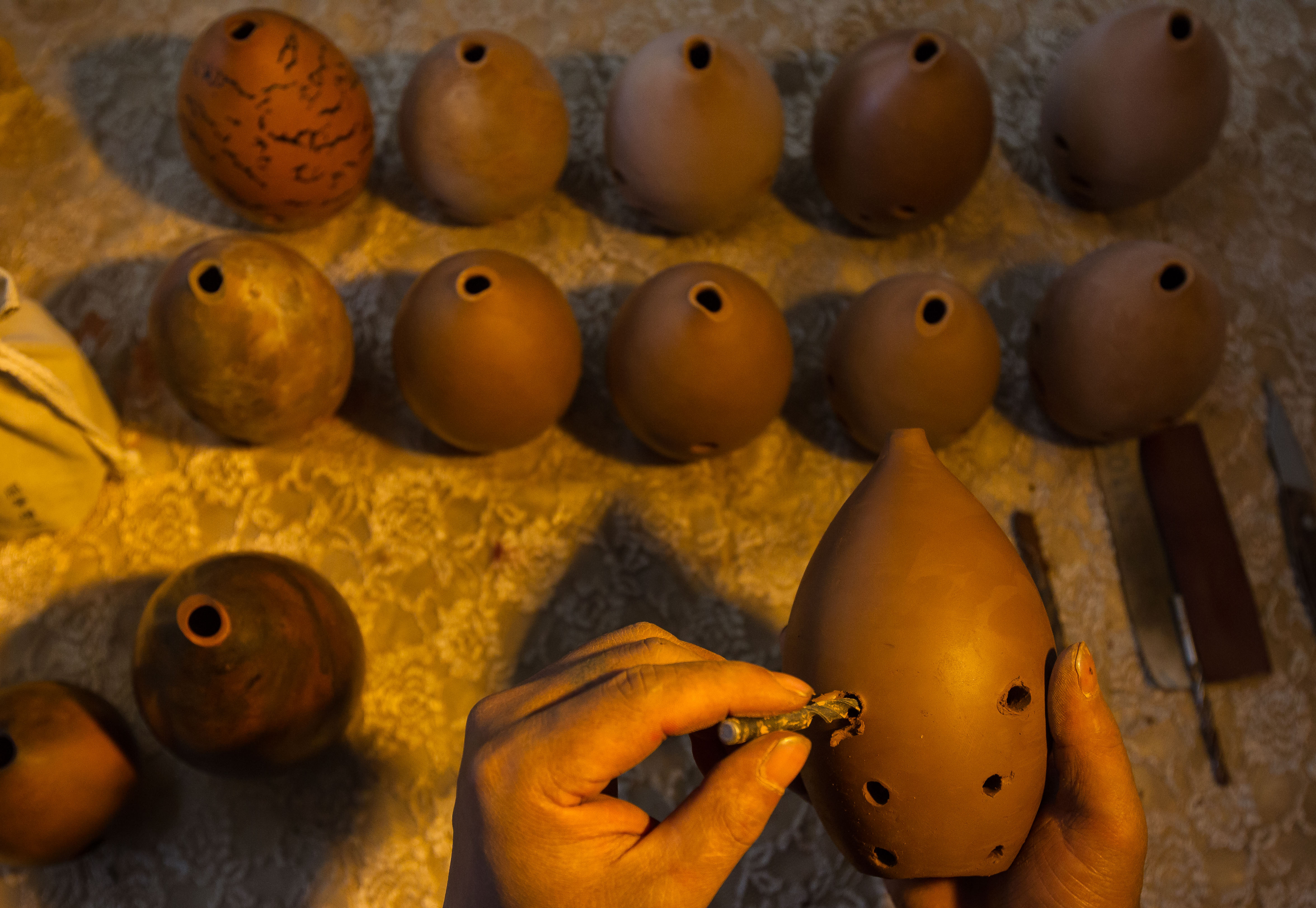 2014年年初,宗华陆续通过各种渠道买了一些几百元不等的埙,开始在家练习吹奏。可是吹奏出的声音完全找不到当年的感觉。于是开始寻找,查询资料,对埙进行深度了解,自己摸索开始制作。后来经朋友介绍,他师从宁夏第一代制埙人李蕴林。开始系统学习埙传统制作与演奏。