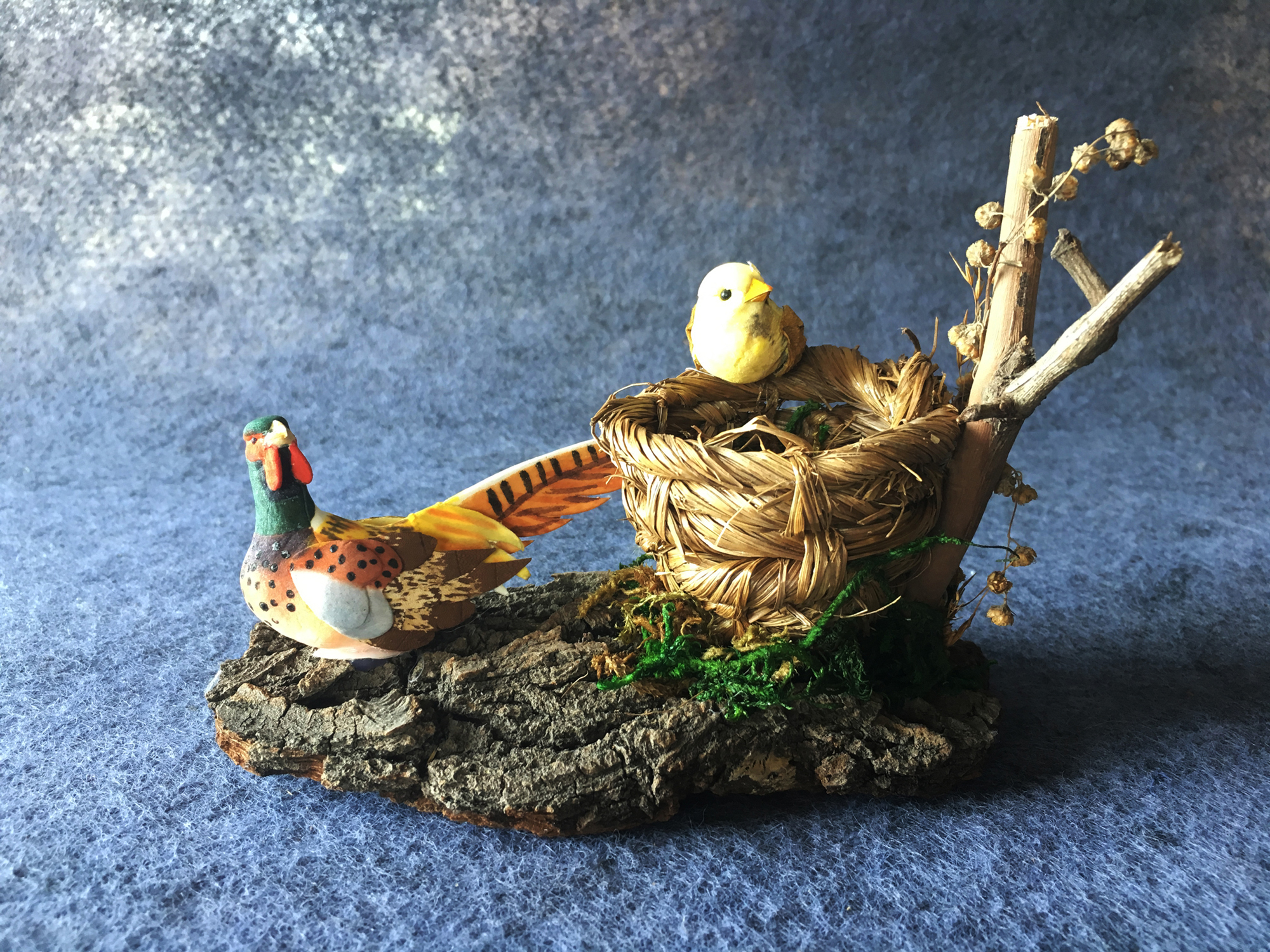 组成部分由天然松树皮、青苔、五味子藤、大粒蒿子,等制作鸟窝底座和配饰,用三棱草等做鸟窝,小鸟部分用天然材料通草,紫芝、云菇等先将小鸟的造型包好,然后安装鸟嘴,眼睛,最后根据大量资料记载的不同种类小鸟的颜色进行上色处理。作品创作的灵感完全出自对大自然的热爱,通过对天然材料的运用,使作品惟妙惟肖。