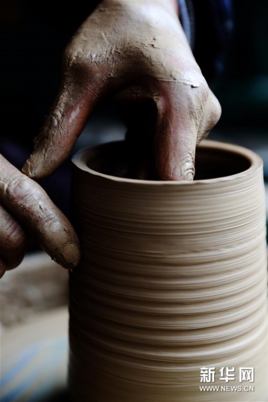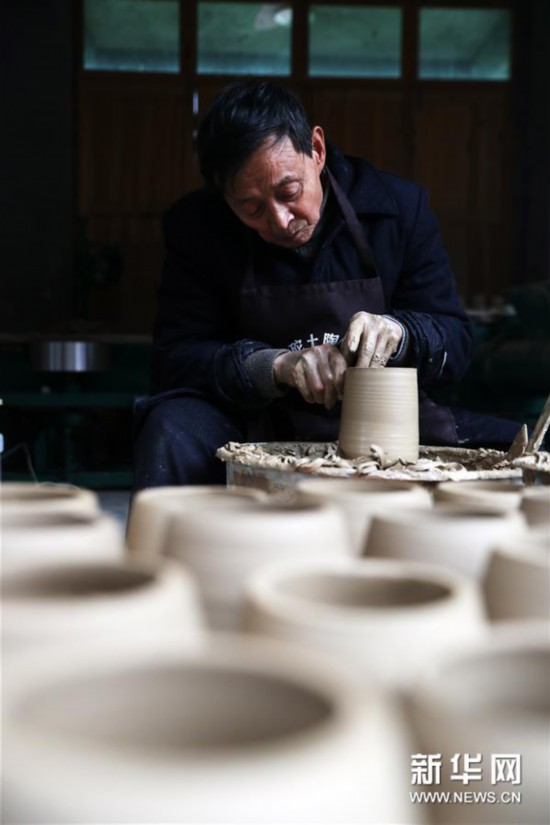 1月8日,在重庆市黔江区濯水镇三门社区,村民刘沛良拉茶壶陶坯。
