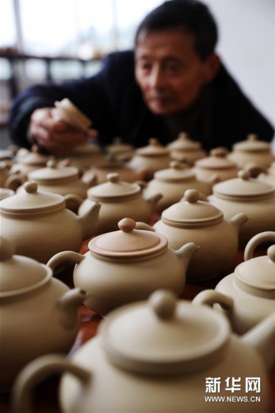 1月8日,在重庆市黔江区濯水镇三门社区,村民刘沛良检查茶壶质量。