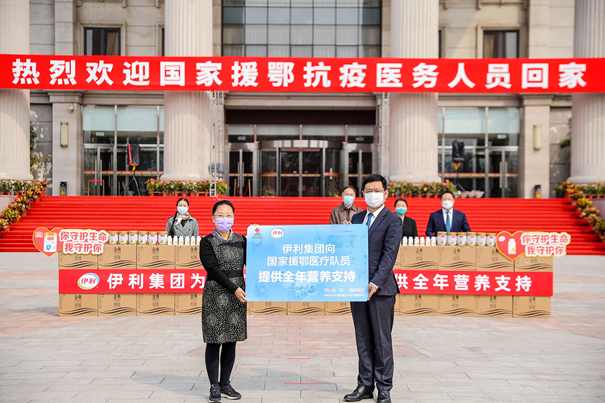 3月31日,伊利集团代表来到国家援鄂医疗队休养驻地,第一时间为平安归来的医疗队员们送上全年营养支持。捐赠仪式上,国家卫生健康委食品安全标准与监测评估司一级巡视员张磊时说,“伊利为疫情防控工作做出了重要贡献,此次,伊利第一时间为凯旋归来的国家援鄂医疗队提供全年营养支持,用爱心和营养持续守护队员们的健康,这一切都让我们看到了龙头企业的社会责任与担当。”
