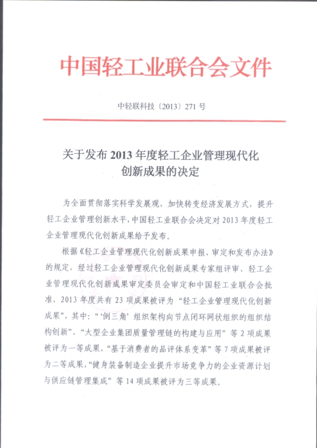 关于发布2013年度轻工企业管理现代化创新成果的决定