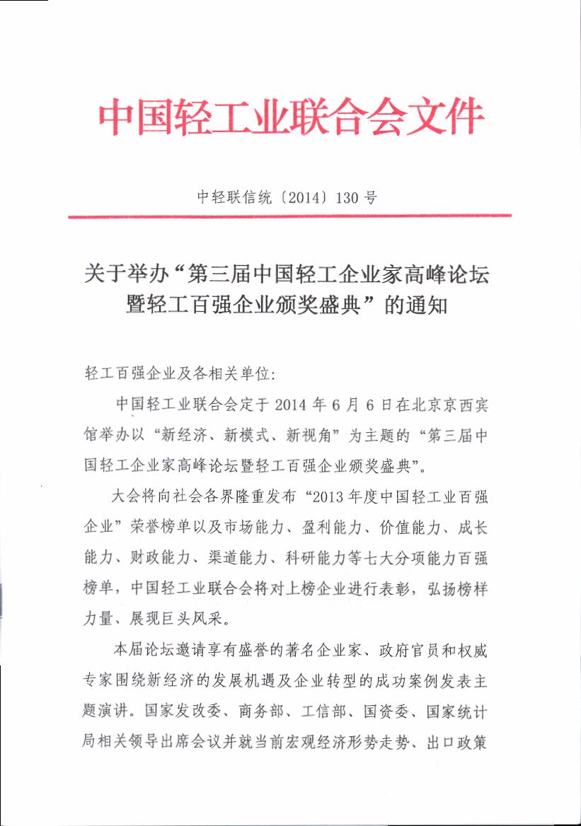 关于举办“第三届中国轻工企业家高峰论坛暨轻工百强企业颁奖盛典”的通知