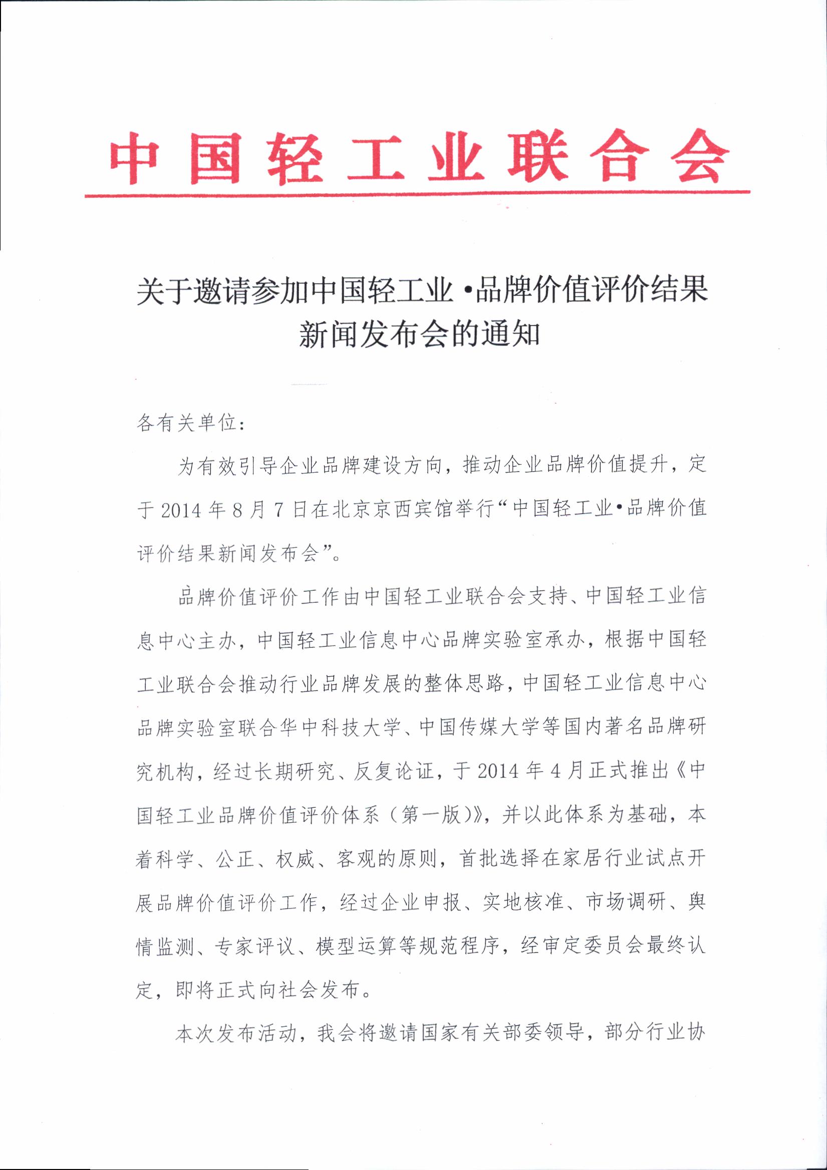 关于邀请参加中国轻工业 • 品牌价值评价结果新闻发布会的通知