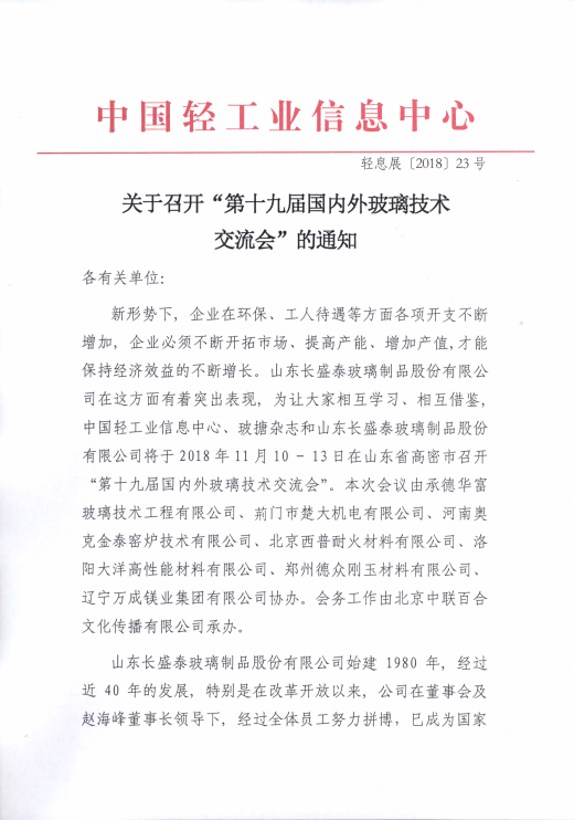 、玻搪杂志和山东长盛泰玻璃制品股份有限公司将于2018年11月10 - 13日在山东省高密市召开“第十九届国内外玻璃技术交流会”。本次会议由承德华富玻璃技术工程有限公司、荊门市楚大机电有限公司、河南奥克金泰窑炉技术有限公司、北京西普耐火材料有限公司、洛阳大洋高性能材料有限公司、郑州德众刚玉材料有限公司、辽宁万成镁业集团有限公司协办。会务工作由北京中联百合文化传播有限公司承办。