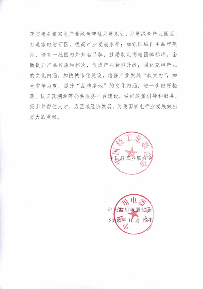 授予广东省中山市南头镇“中国家电品牌基地·南头”称号