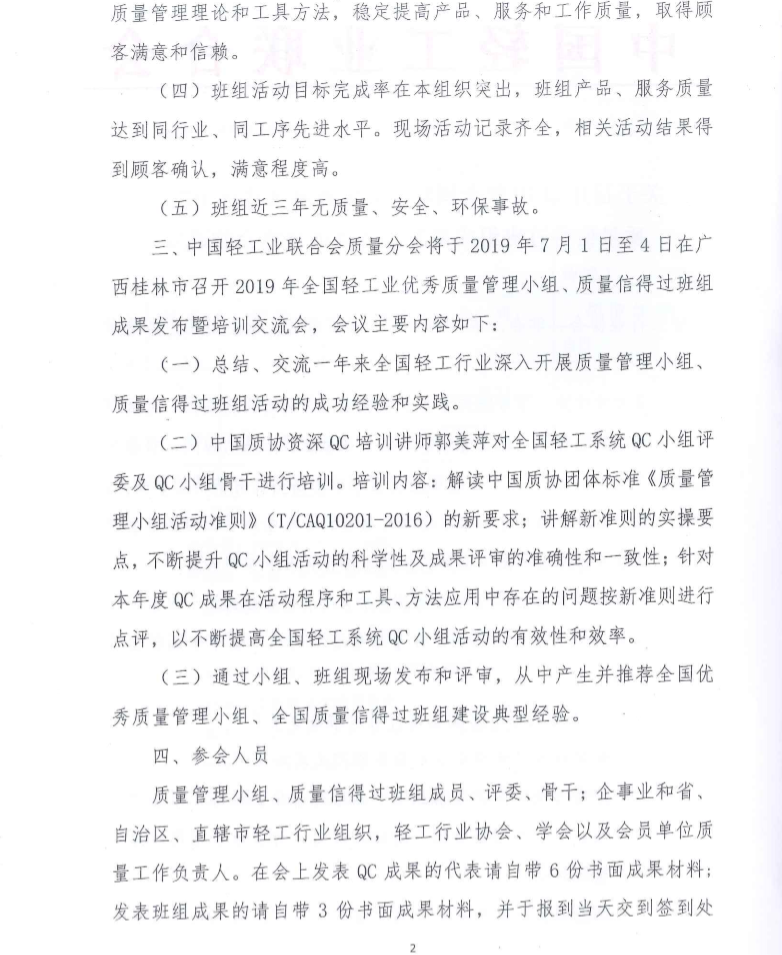 关于召开2019年全国轻工业优秀质量管理小组、质量信得过班组成果发布暨培训交流会的通知