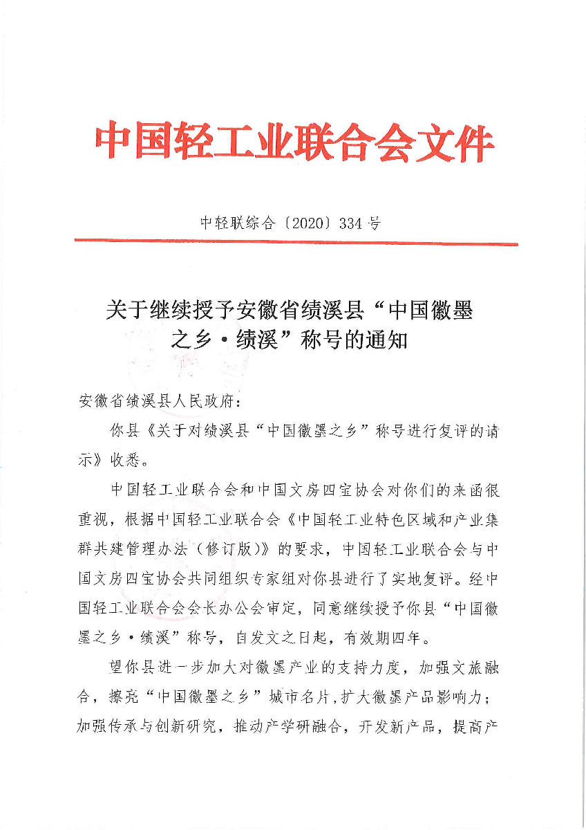 关于继续授予安徽省绩溪县“中国徽墨之乡·绩溪”称号的通知