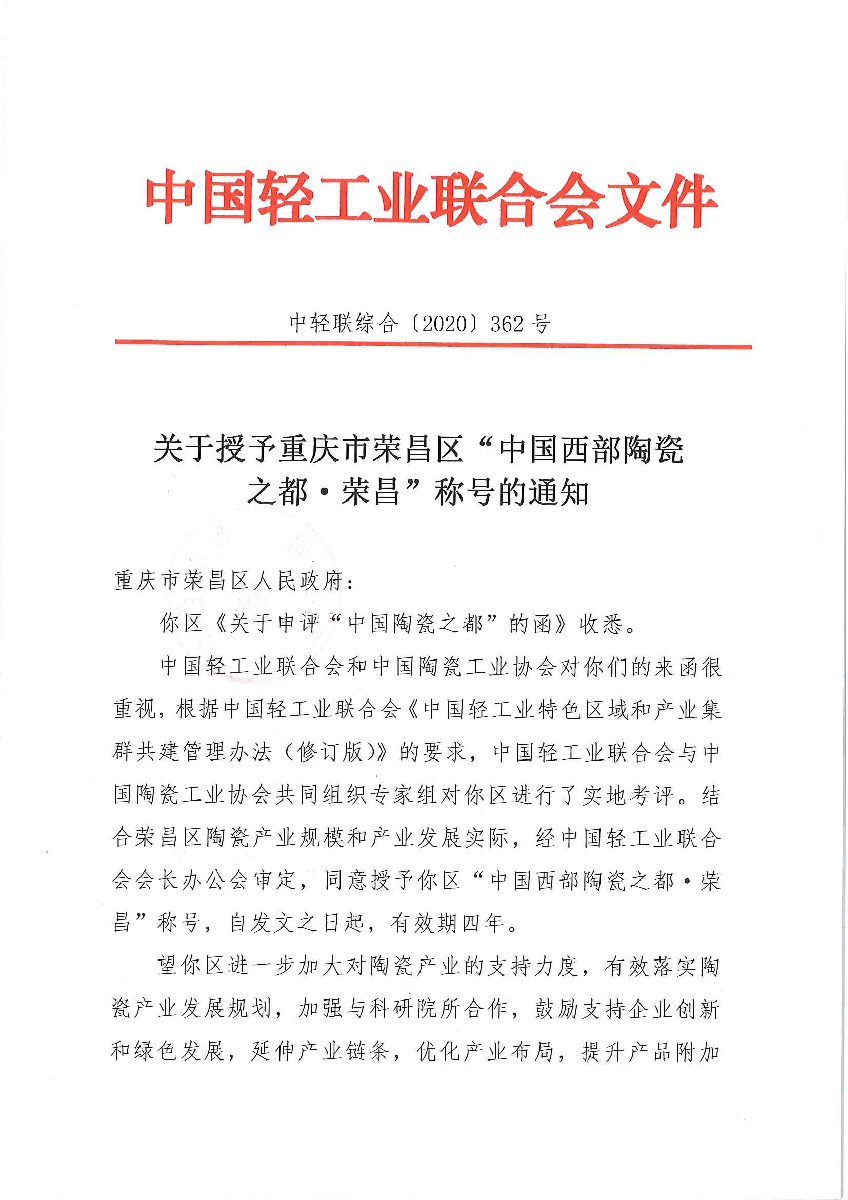 关于授予重庆市荣昌区“中国西部陶瓷之都·荣昌”称号的通知