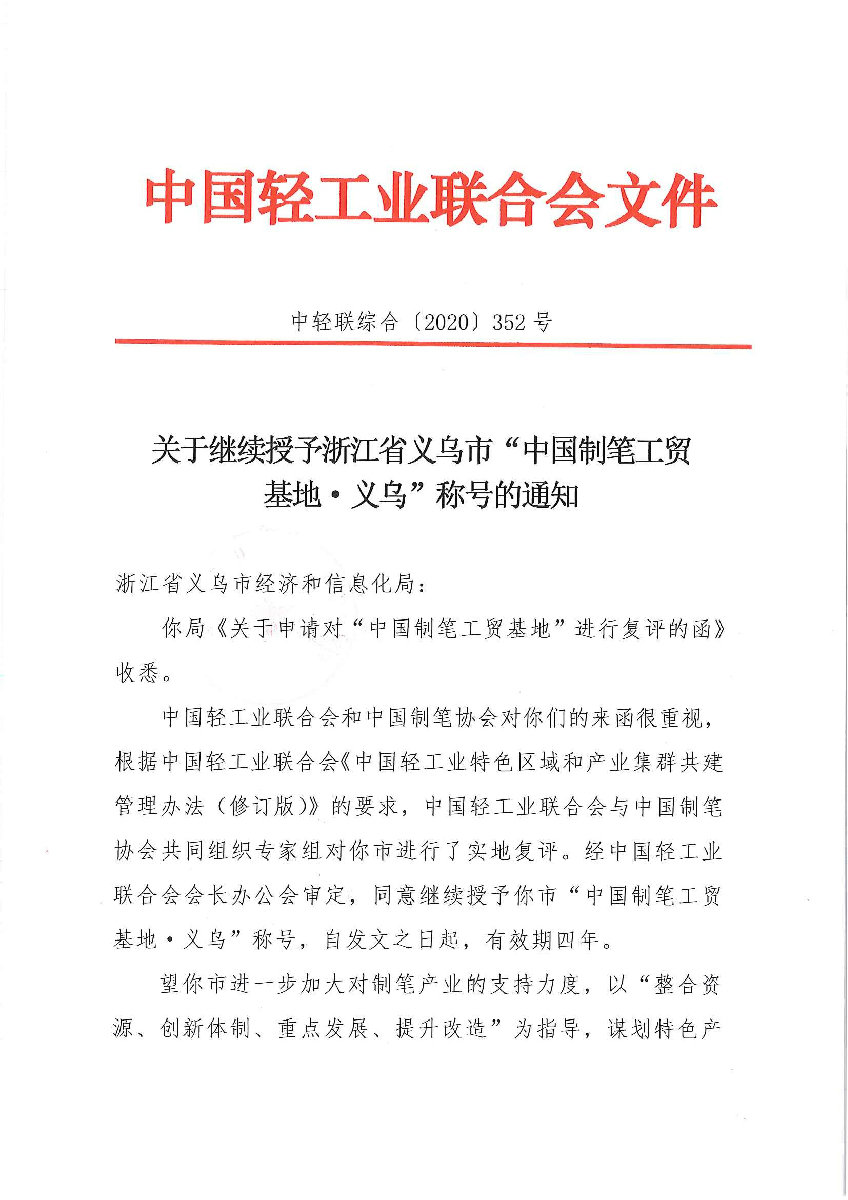 关于继续授予浙江省义乌市“中国制笔工贸基地·义乌”称号的通知