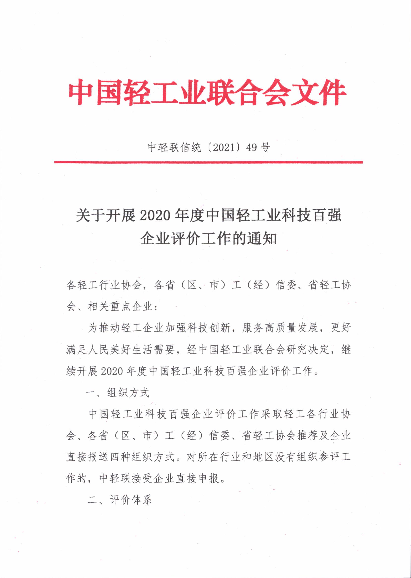 2020年度中国轻工业科技百强企业评价工作启动