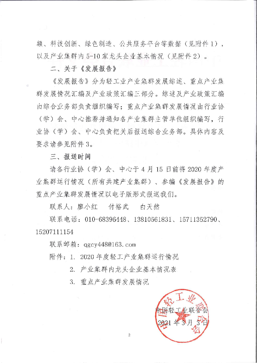 关于报送2020年度产业集群运行情况及组织编制《中国轻工业产业集群发展报告》的通知