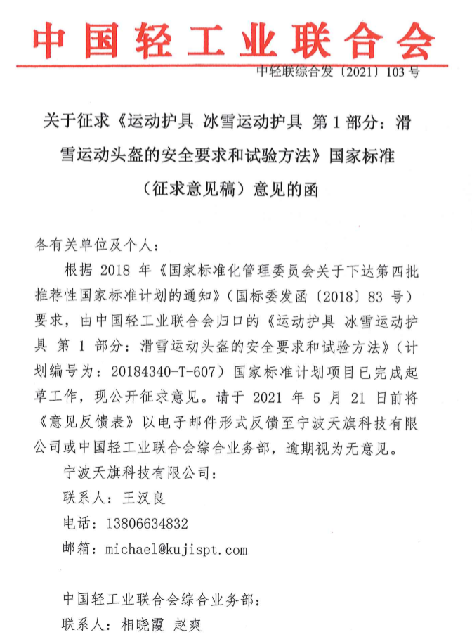 关于征求《运动护具 冰雪运动护具 第1部分:滑雪运动头盔的安全要求和试验方法》国家标准(征求意见稿)意见的函