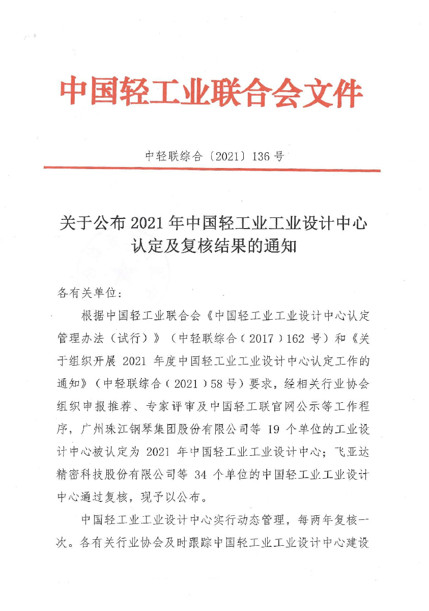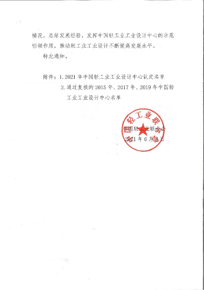 关于公布2021年中国轻工业工业设计中心认定及复核结果的通知