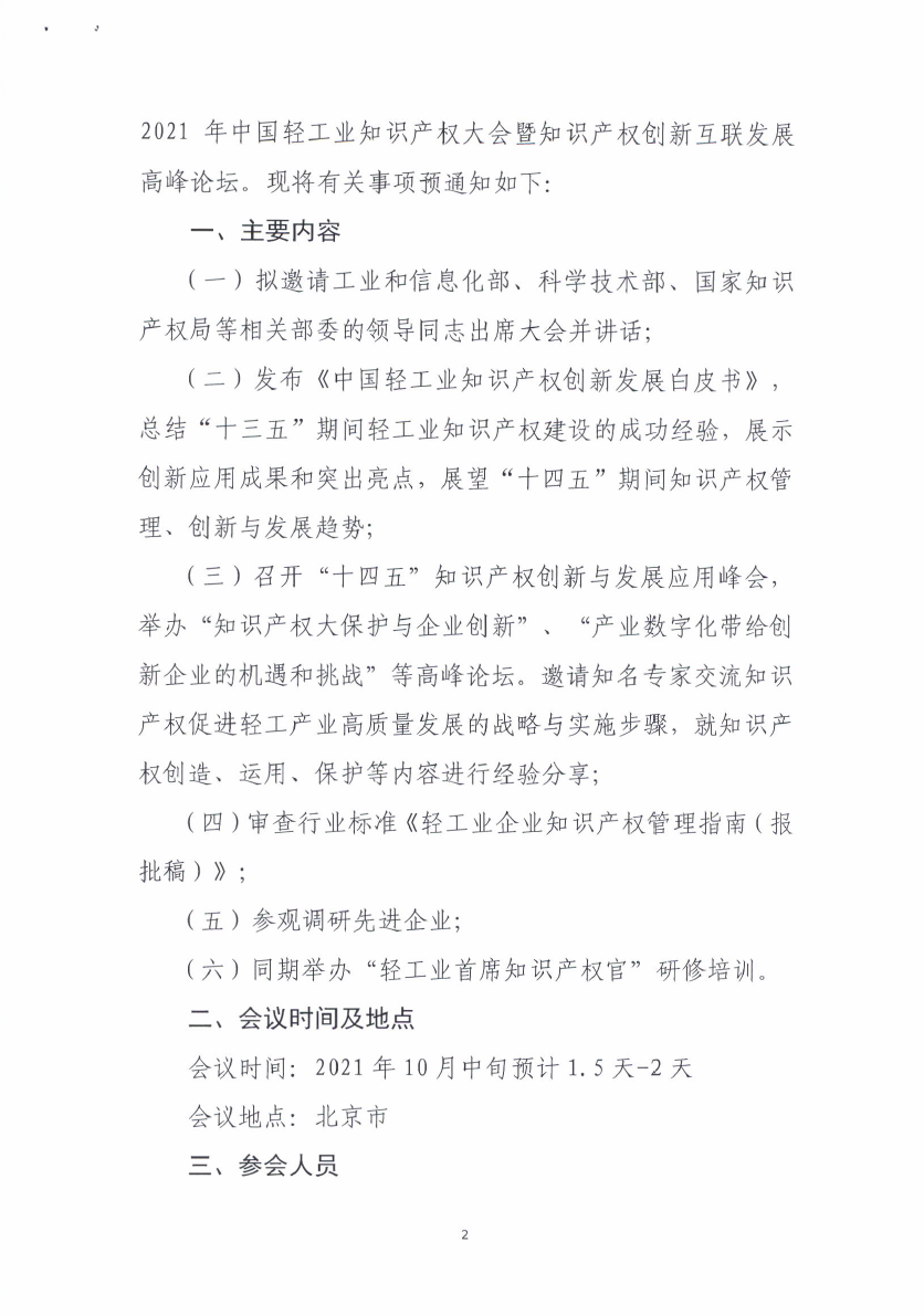 关于举办2021年中国轻工业知识产权大会暨知识产权创新互联发展高峰论坛的预通知