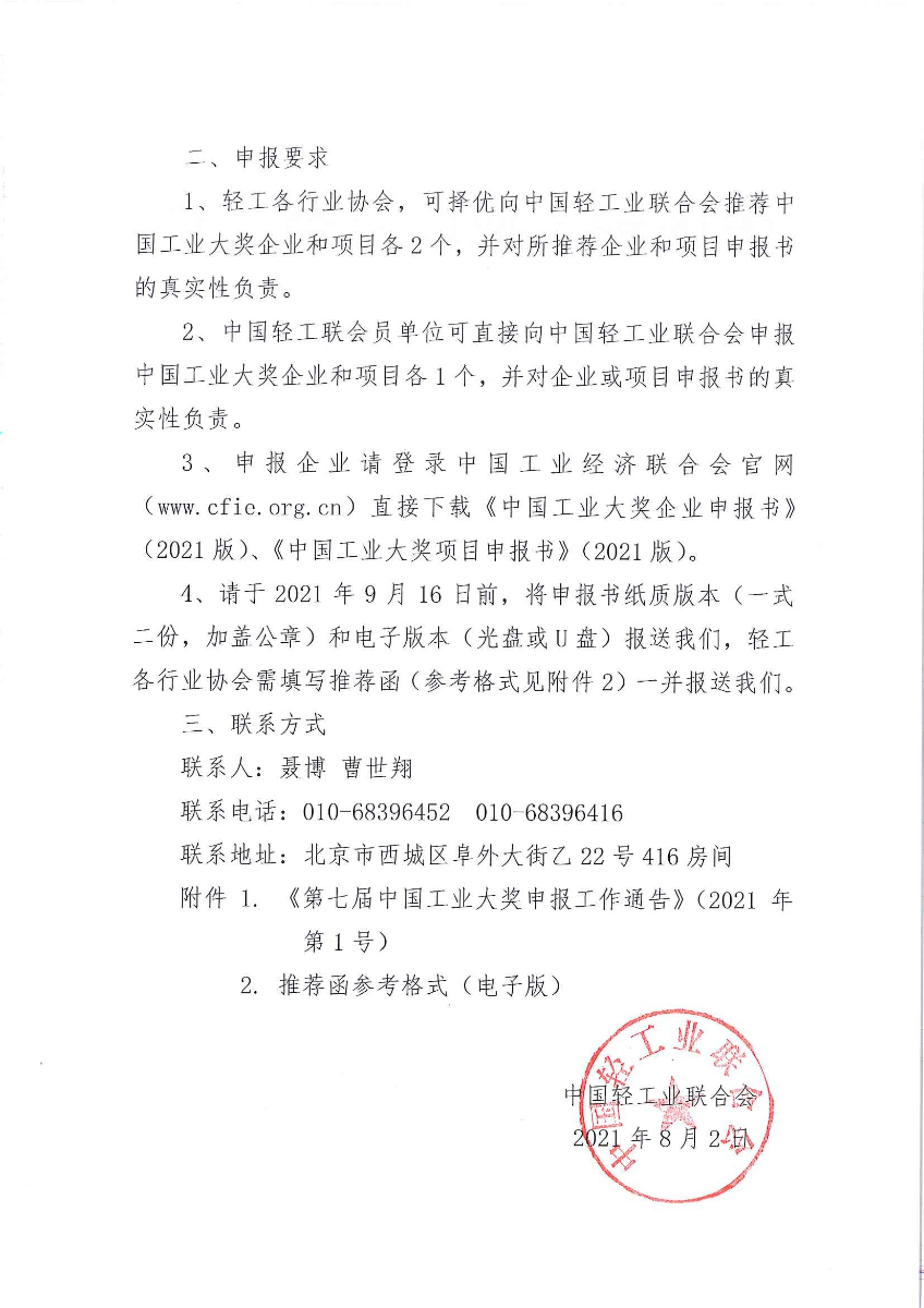 关于征集第七届中国工业大奖申报企业 (项目)的通知