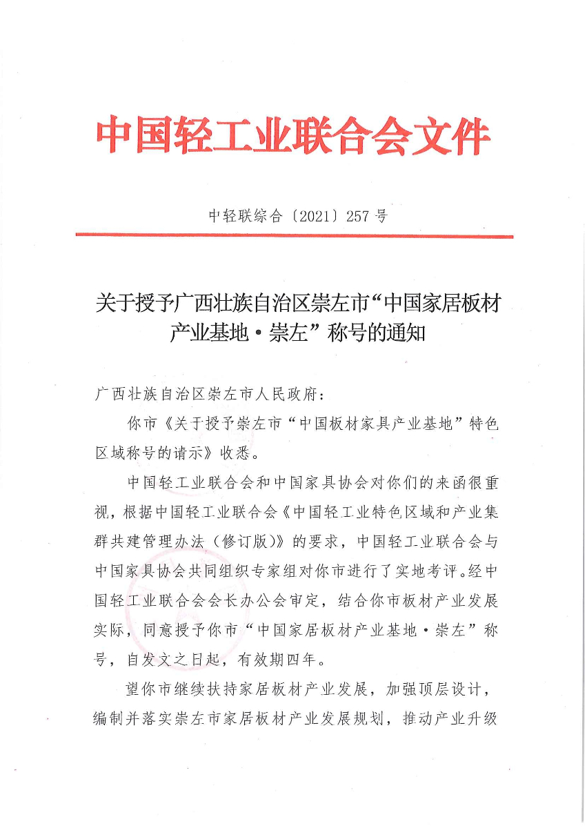 关于授予广西壮族自治区崇左市“中国家居板材产业基地·崇左”称号的通知