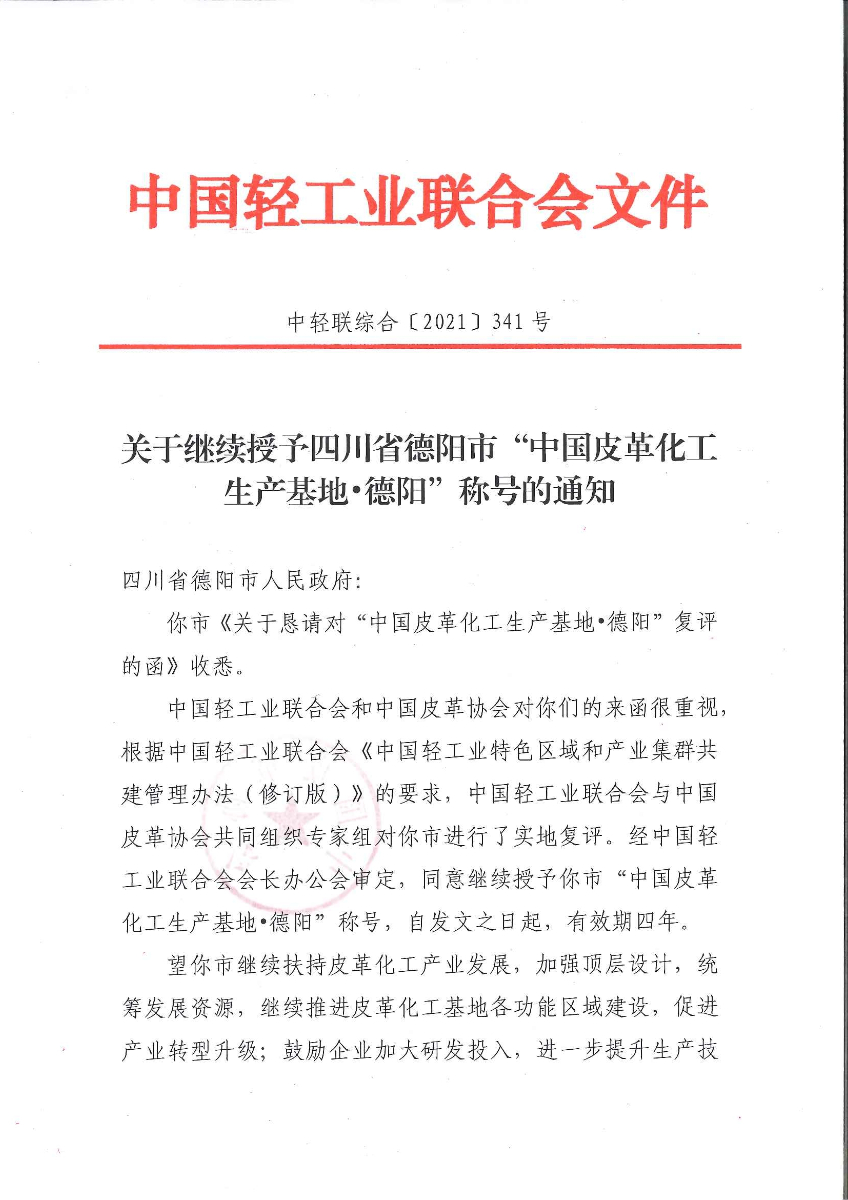 关于继续授予四川省德阳市“中国皮革化工生产基地·德阳”称号的通知