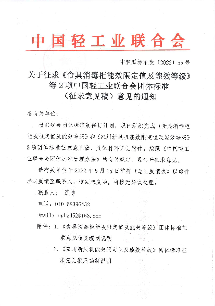 关于征求《食具消毒柜能效限定值及能效等级》等2项 团体标准(征求意见稿)意见的通知
