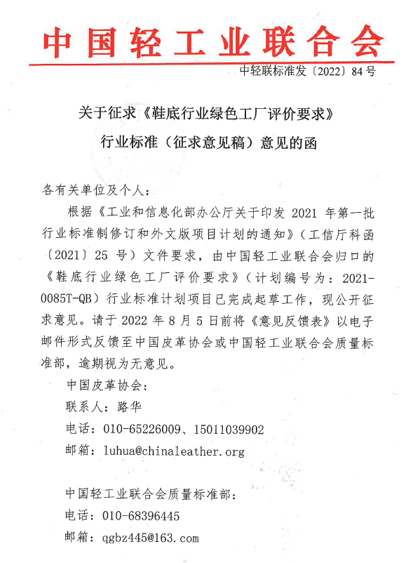 关于征求《鞋底行业绿色工厂评价要求》行业标准(征求意见稿)意见的函