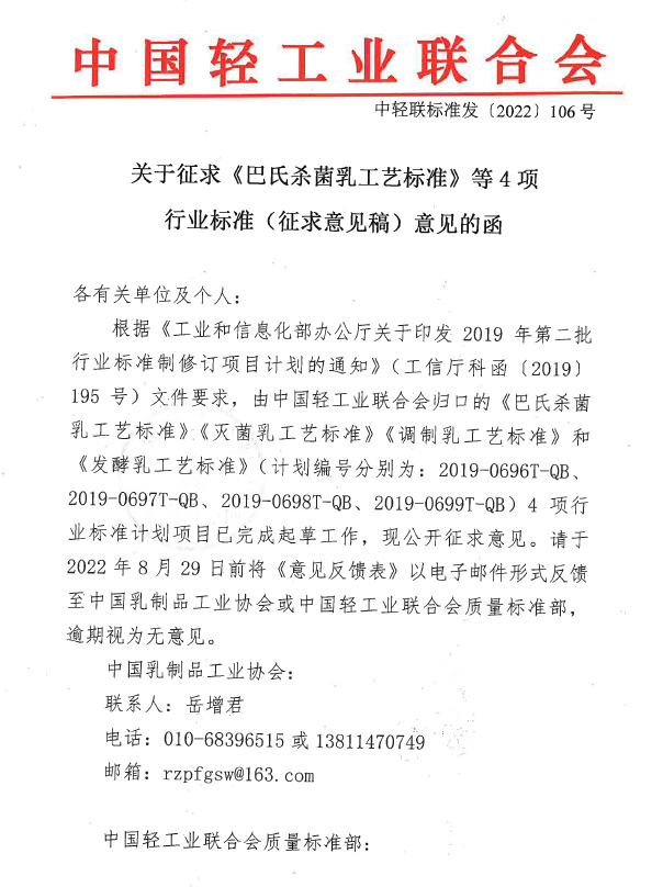 关于征求《巴氏杀菌乳工艺标准》等4项行业标准(征求意见稿)意见的函