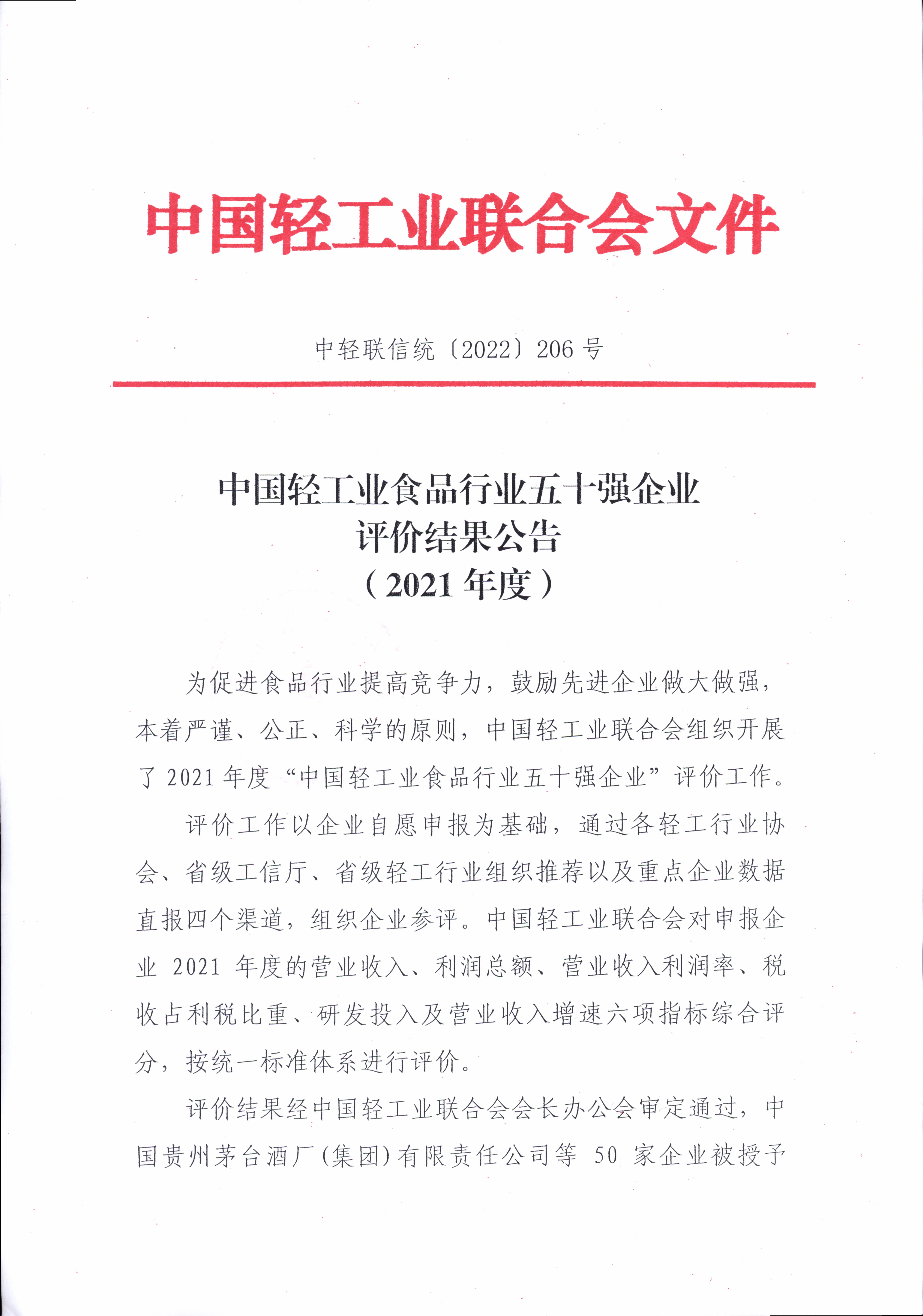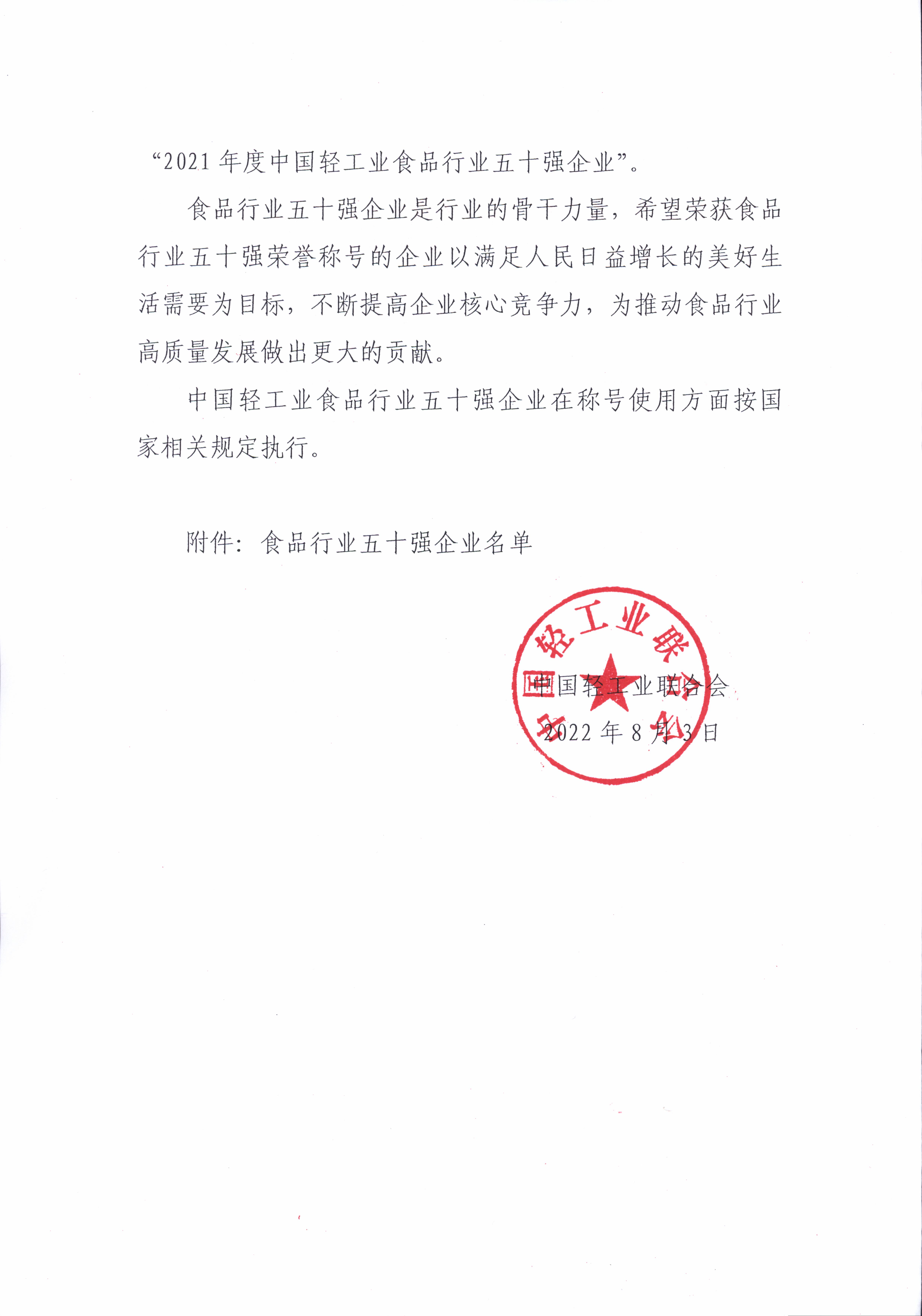 中国轻工业食品行业五十强企业评价结果公告(2021年度)
