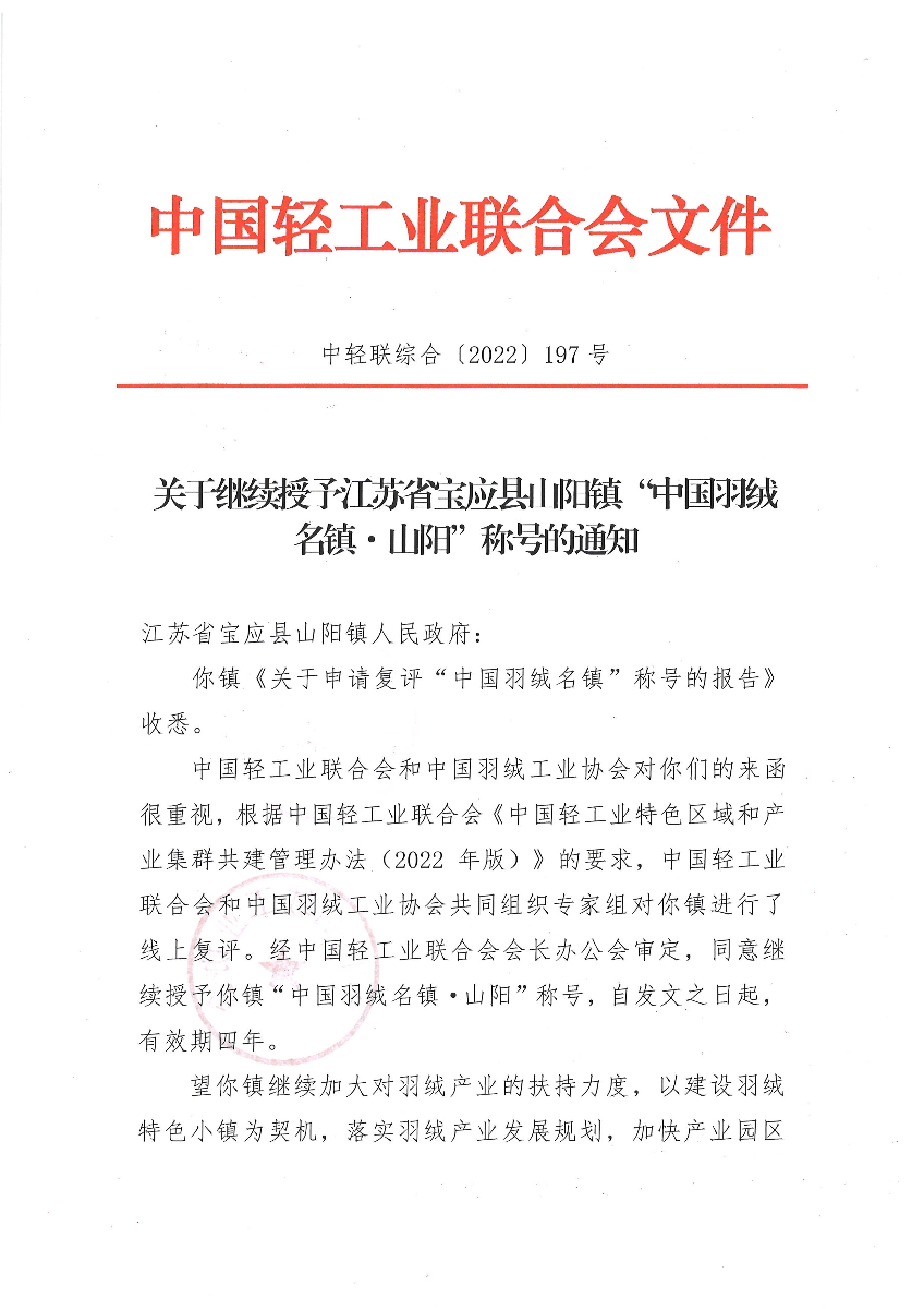 关于继续授予江苏省宝应县山阳镇“中国羽绒名镇·山阳”称号的通知