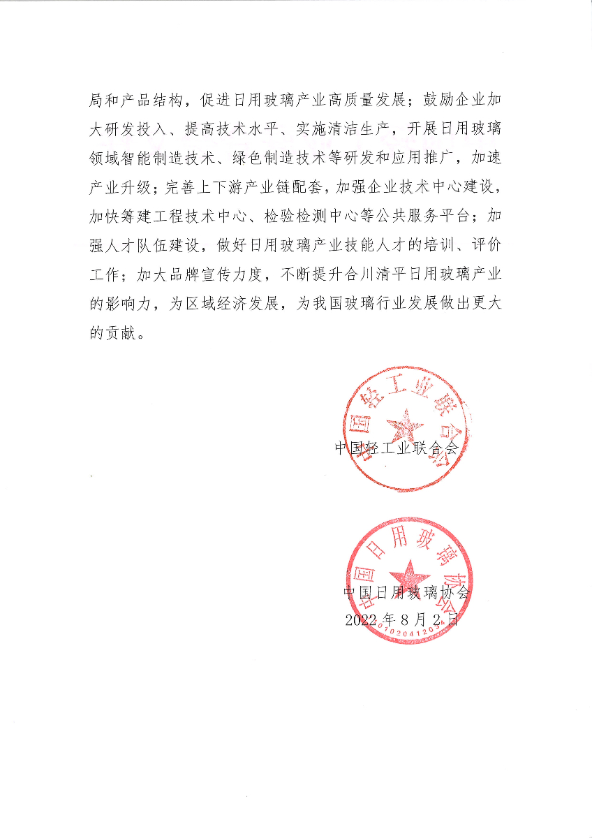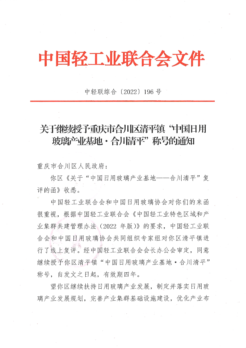 关于继续授予重庆市合川区清平镇“中国日用玻璃产业基地·合川清平”称号的通知