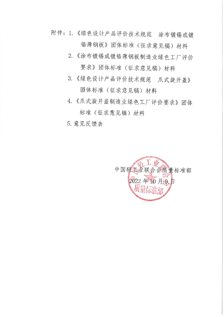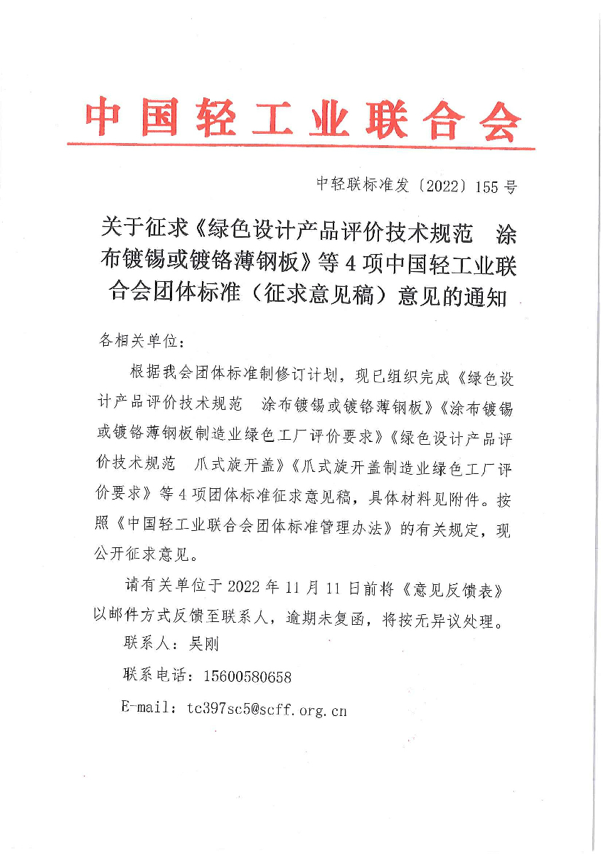 关于征求《绿色设计产品评价技术规范 涂布镀锡或镀铬薄钢板》等4项 团体标准(征求意见稿)意见的通知