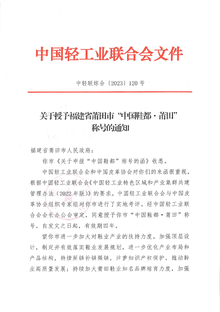 关于授予福建省莆田市“中国鞋都·莆田”称号的通知