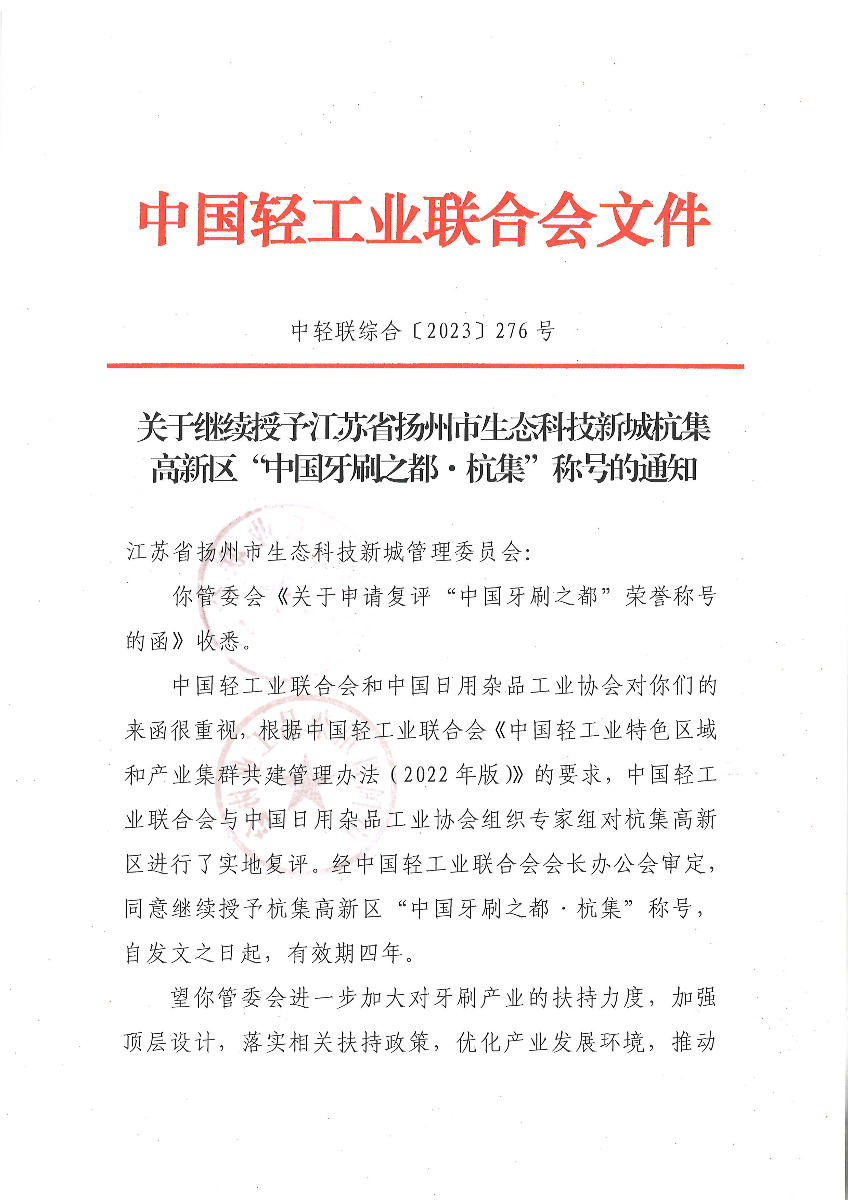 关于继续授予江苏省扬州市生态科技新城杭集高新区“中国牙刷之都·杭集”称号的通知